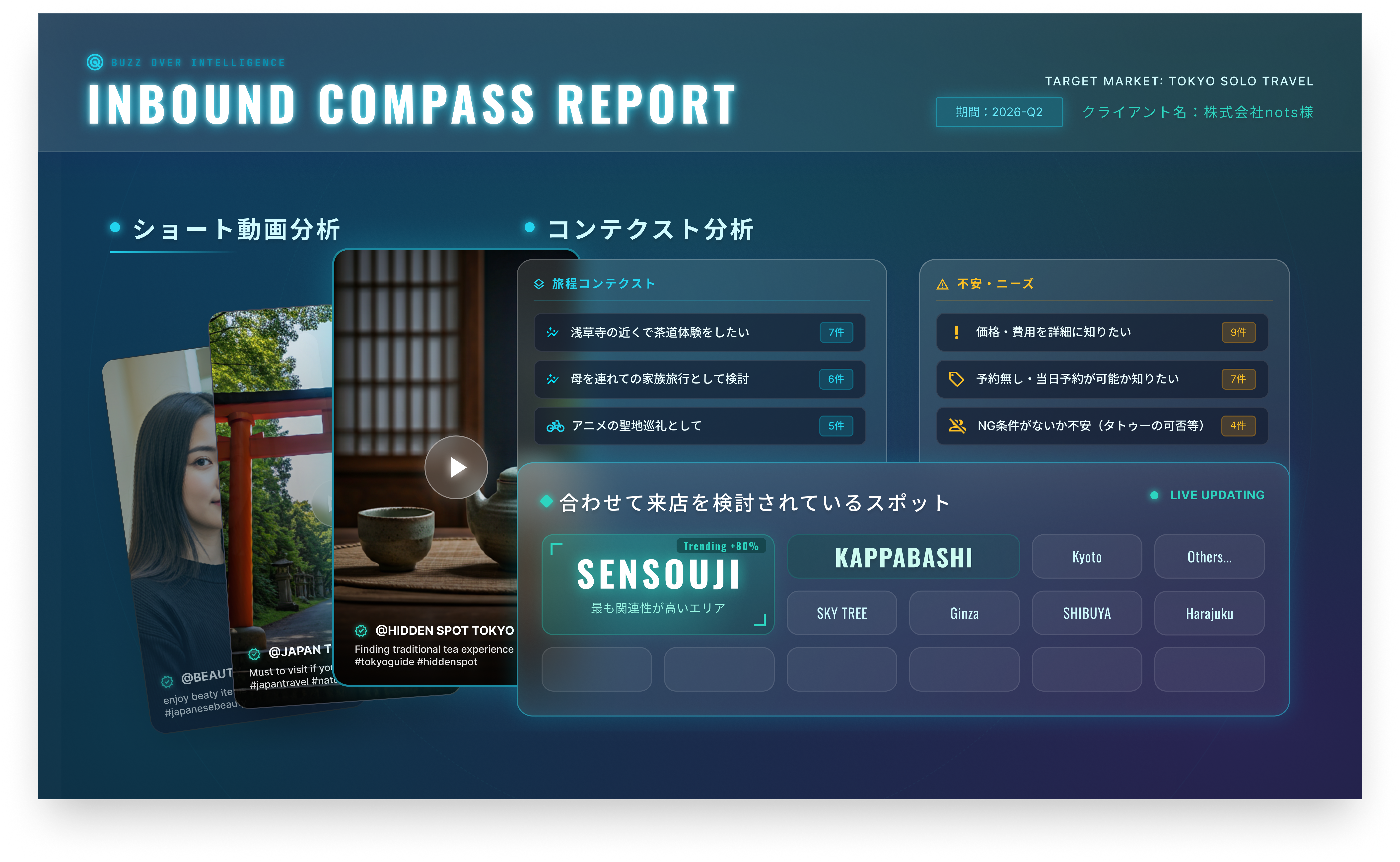 「BUZZ OVER」なら、動画制作から煩雑な集客オペレーションまで丸投げ可能。「SNSでの認知拡大」と「来店までの摩擦ゼロ化」をワンパッケージで提供する、インバウンド特化型ソリューションです。