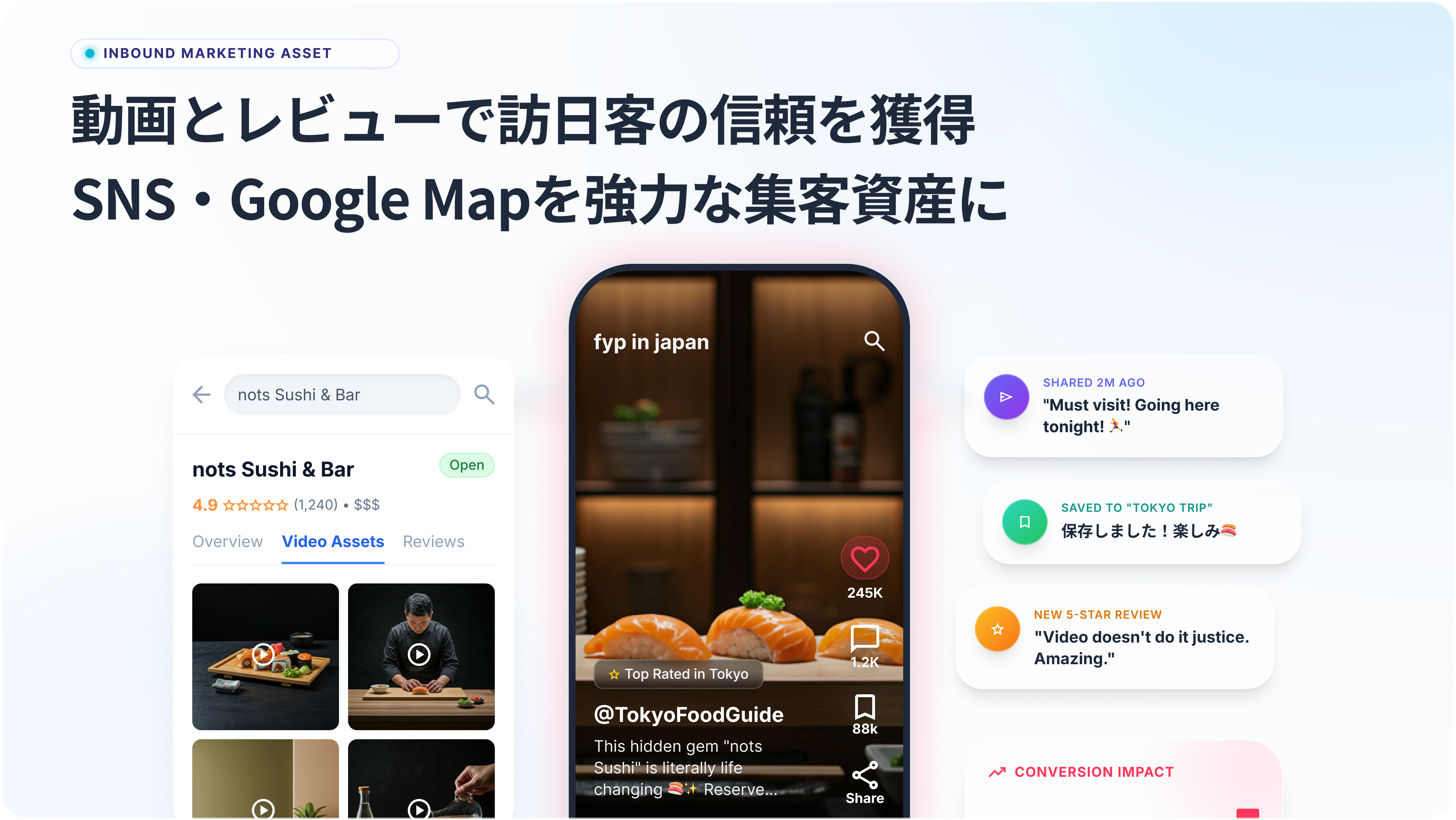 認知を広げるだけではインバウンド集客は完結しません。動画に対する海外ユーザーの反応をAIが24時間解析し、言語の壁や予約時の「摩擦」を特定。GoogleマップのFAQや導線を自動でアップデートし、獲得したトラフィックを余すことなく来店へと繋ぎます。